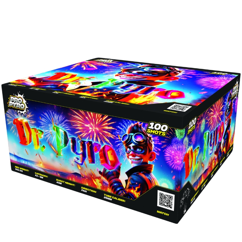 Dr. Pyro Compound Barrage 1.3G is a wild experiment in colour, strobe and crackling brilliance featuring vivid mines, gold-to-colour transitions and electric lace effects, it bursts with personality from sunglow strobes and blue pearls to crackling willows and vibrant colour shifts.
