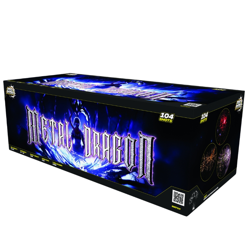 Metal Dragon Compound barrage 1.3g ignites the sky with a powerful combinition of blue mines, vibrant pearls, and intense strobe effects. From blue and white strobe willows to gold and time rain crysanthemums, the display flows with striking color transsitions and dynamic bursts. The intricate dance of blue palms, red strobes, and silver fish creates an intense, almost mythical performance that builds in both beauty and power.
