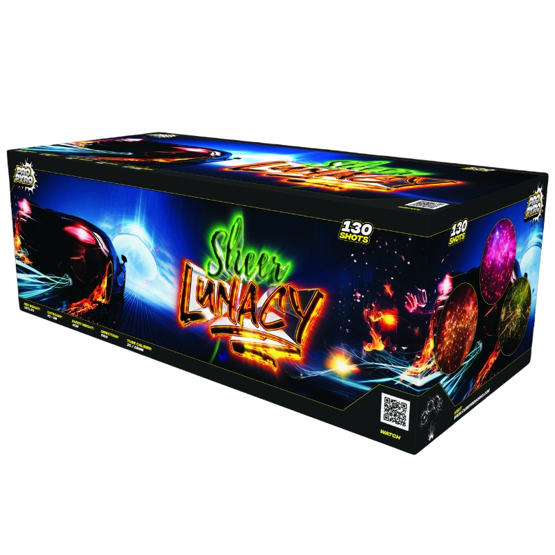 Sheer Lunacy Compound barrage 1. 3g offers an electrifying fusion of colors and effects, delivering a dazzling, chaotic display. From radiat swimming stars in red,green and purple to shimmering titanium willows. It blends vibrant dahlias with glittering strobes. Explosive brocade tails, fiery red plums, and crackling gold comets create a whirlwide of ferenetic energy.